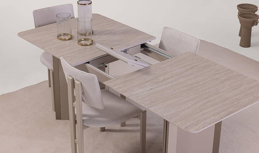 - Permukaan Glossy atau Matte: Finishing high-gloss atau matte halus pada meja memudahkan proses pembersihan. Warna krem ini membantu menonjolkan tekstur dan warna dekorasi pelengkap dalam ruangan.