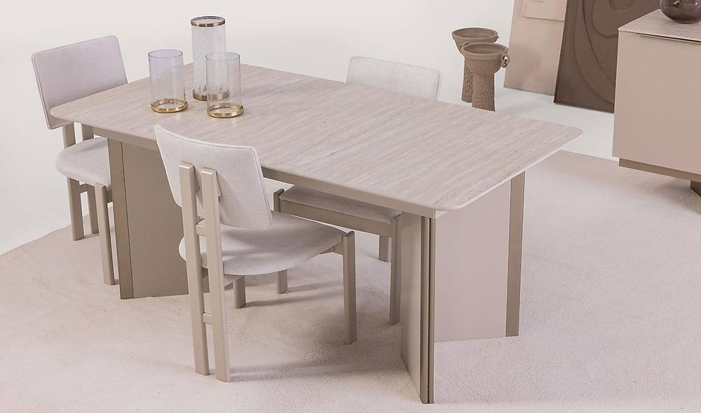 Daya tarik utama Set Makan Ancol adalah kesederhanaan warnanya yang dominan krem, memantulkan cahaya dan membuat ruangan terasa lebih besar.