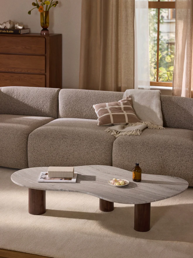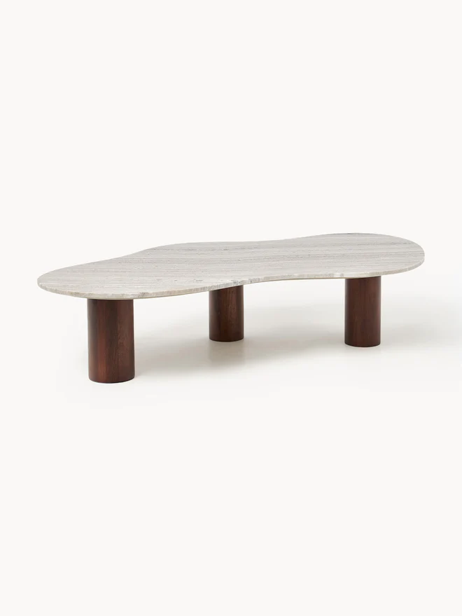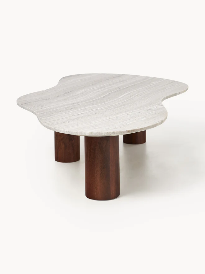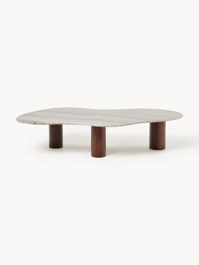 Arve coffee table ini memadukan kemewahan marmer alami dengan kehangatan kayu jati solid dalam desain modern yang elegan. Permukaan meja bermotif alami marmer tampil menawan dengan bentuk asimetris yang lembut dan artistik. Selain itu, tiga kaki silinder dari kayu jati memberikan keseimbangan visual sekaligus kekuatan struktural yang luar biasa. Desainnya menciptakan harmoni sempurna antara gaya kontemporer dan keindahan alami.