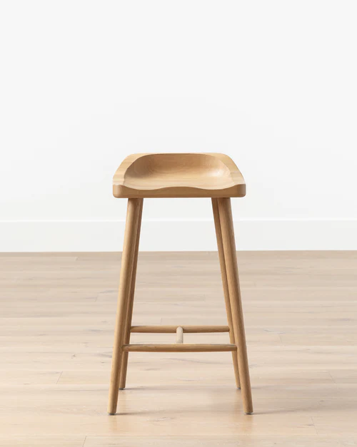 Barstool Lumira hadir dengan rangka kayu solid berwarna natural. Dudukan kayu membentuk lekuk ergonomis. Kaki ramping memberi kesan ringan. Tersedia pijakan kaki untuk stabilitas. Finishing halus menonjolkan serat kayu.