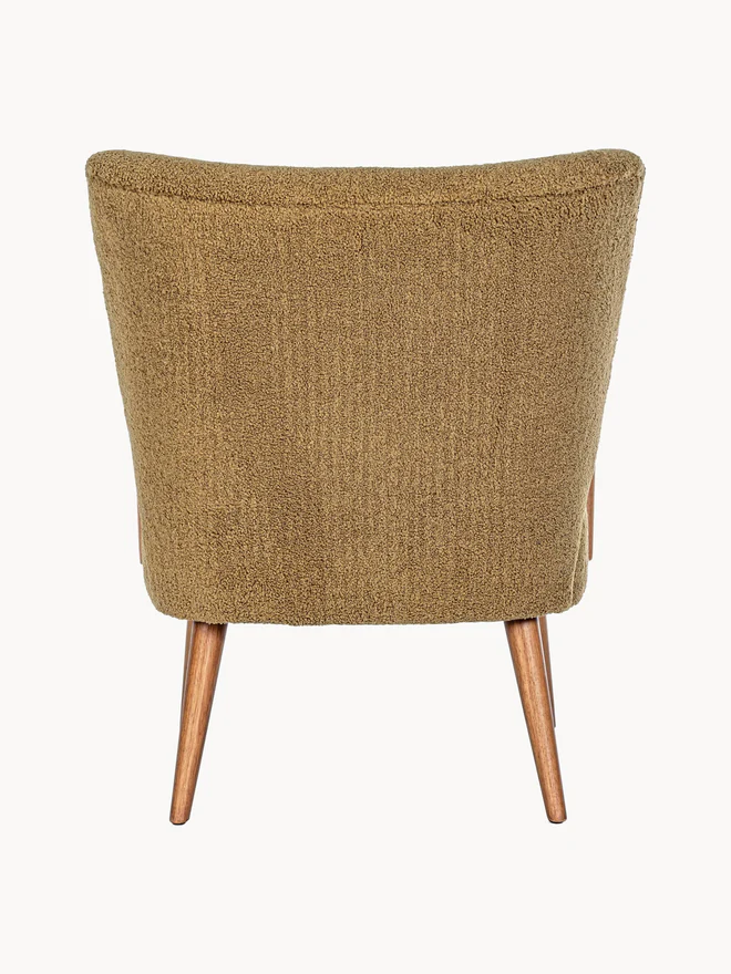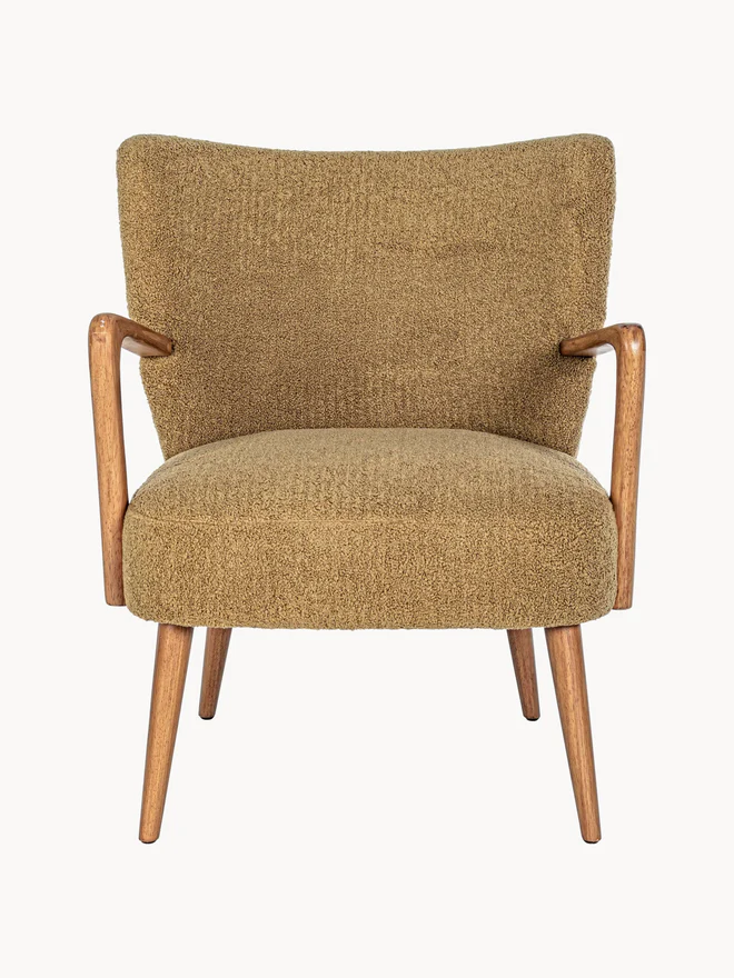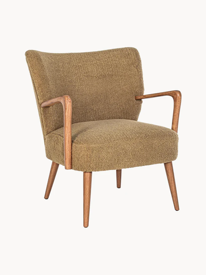 Bhaskara Lounge Chair memadukan rangka kayu jati hangat dengan balutan bouclé cokelat zaitun yang lembut. Selain itu, sandaran lebar melengkung menopang punggung, lalu dudukan tebal memberi rasa empuk stabil. Di sisi lain, armrest kayu ramping dan kaki meruncing menghadirkan gaya retro modern yang ringan.