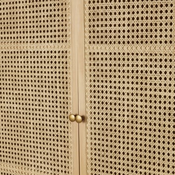 Calia Wardrobe memadukan rangka kayu solid warna natural yang hangat. Selain itu, pintu anyaman rotan memberi tekstur airy dan estetik. Kemudian, handle bulat warna emas menambah aksen manis. Lebih lanjut, garis lemari yang tinggi membuat siluetnya terlihat ramping. Akhirnya, kaki kokoh menjaga lemari stabil untuk pemakaian harian.