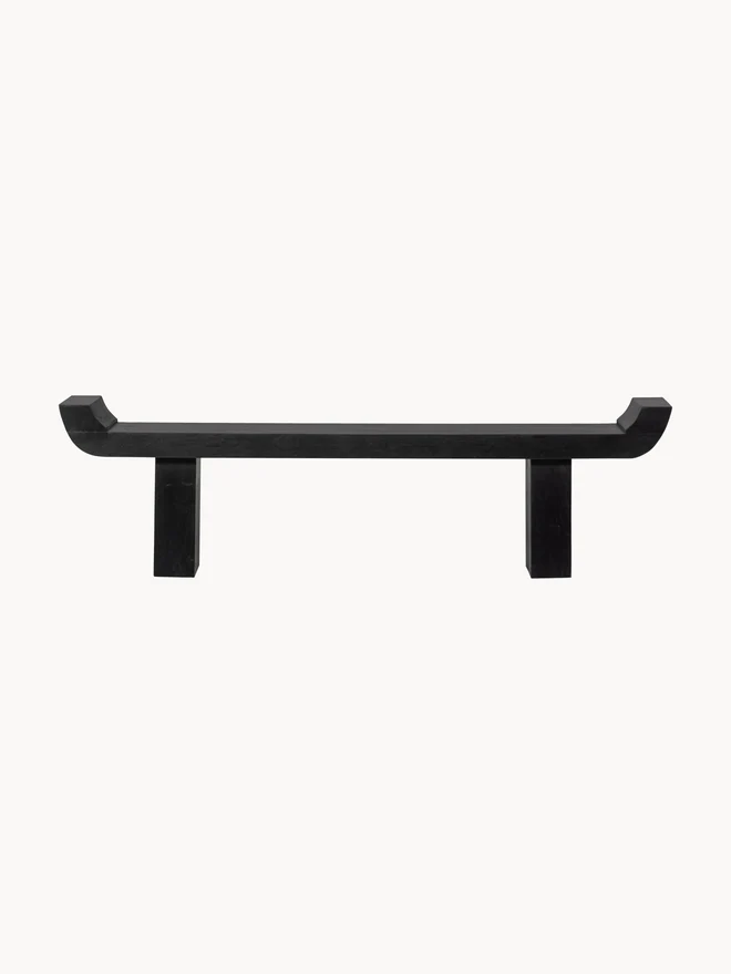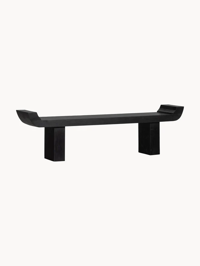 Canoe Bench menampilkan bangku kayu solid hitam dengan ujung terangkat seperti perahu. Selain itu, dudukan panjangnya rata dan halus, lalu nyaman untuk dua hingga tiga orang. Di sisi lain, kaki balok tebal memberi stabilitas kuat, kemudian finishing hitam doff terlihat tegas.
