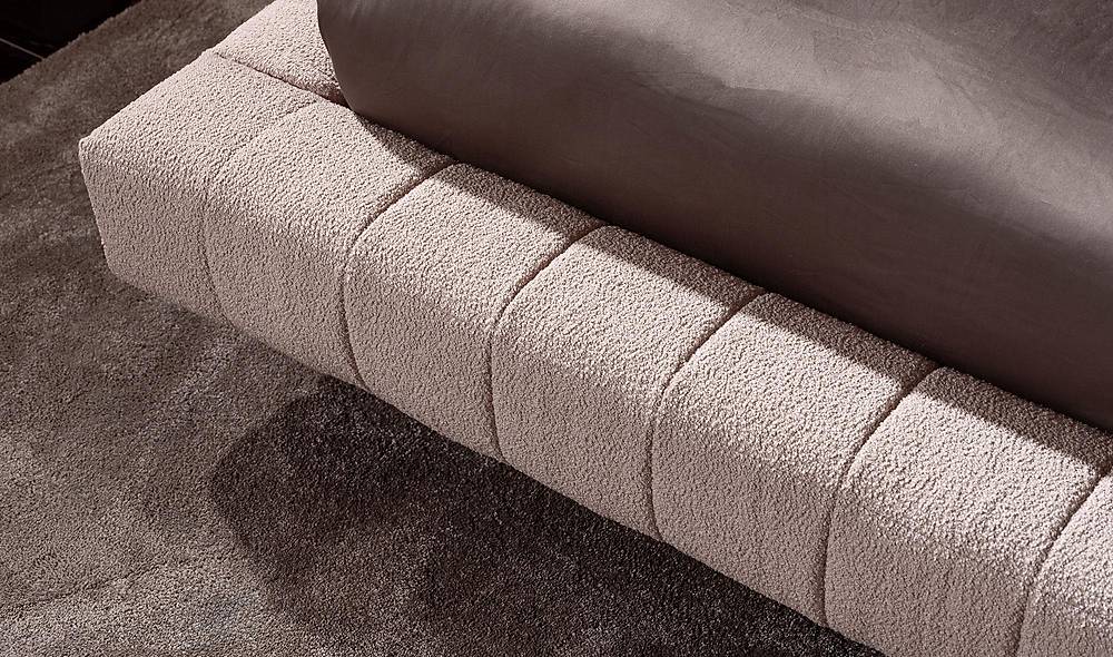 Seluruh kerangka tempat tidur, termasuk bagian bawah (footboard), juga memiliki jahitan serupa, menciptakan tampilan yang kohesif dan rapi. Tempat tidur ini dilapisi dengan kain berwarna putih tulang yang memberikan kesan bersih, cerah, dan menenangkan.