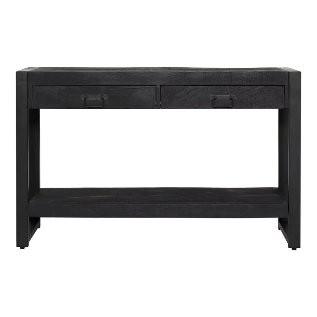 Damar Side Table memamerkan top kayu solid warna hitam pekat. Selain itu, rangka besi hitam membentuk siluet kotak yang tegas. Kemudian, dua laci tarik memberi ruang simpan kecil yang rapi. Lebih lanjut, handle besi gelap menambah aksen industrial. Akhirnya, rak bawah lebar memperkuat fungsi penyimpanan harian.