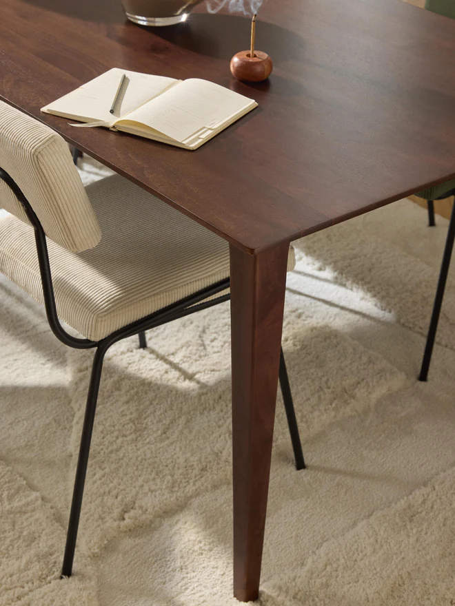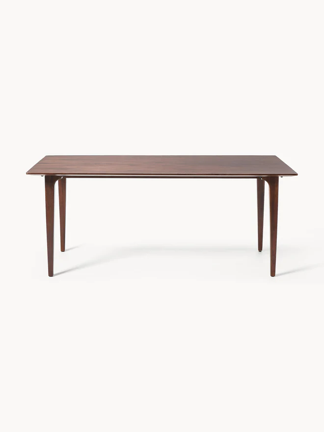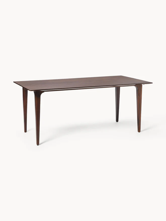 Permukaan kayu jatinya menampilkan tekstur alami yang memancarkan kehangatan dan keindahan alami. Sementara itu, kaki meja yang meruncing menambah kesan ringan sekaligus memperkuat karakter desainnya. Setiap sudut meja menunjukkan perhatian tinggi terhadap detail dan pengerjaan yang rapi.