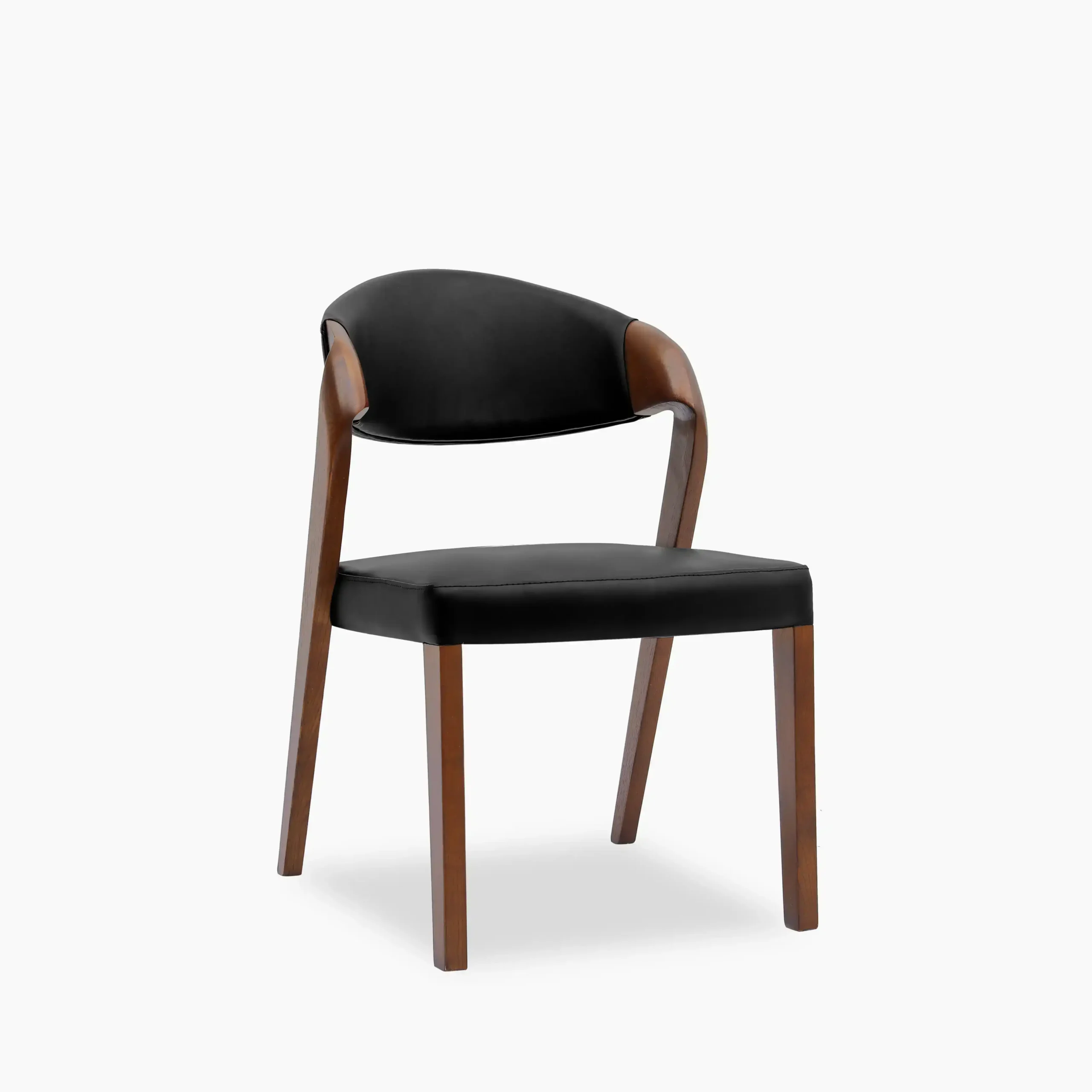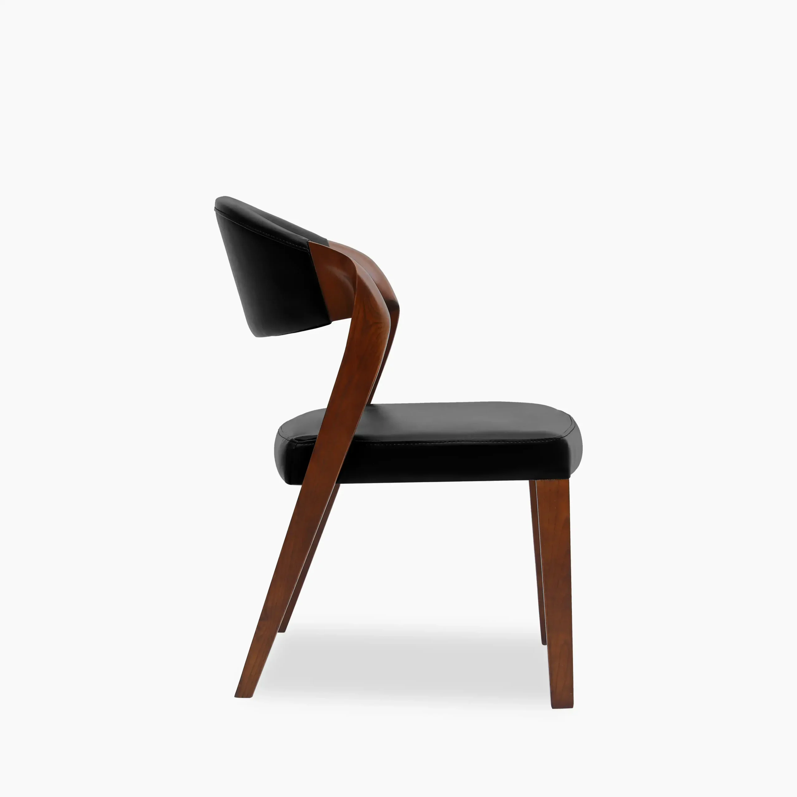 Dharma Dining Chair menggabungkan desain modern yang elegan dengan keanggunan klasik kayu solid. Kursi ini menampilkan kombinasi sempurna antara rangka kayu berwarna walnut hangat dan bantalan kulit sintetis hitam yang halus. Lekukan halus pada sandaran punggung memberikan tampilan yang dinamis sekaligus menambah kenyamanan saat bersandar, menjadikannya pilihan ideal untuk ruang makan bergaya kontemporer maupun mid-century modern.