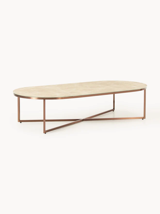 Firea Coffee Table memadukan kemewahan marmer alami dengan keanggunan rangka besi berlapis warna emas mawar. Permukaan marmer berbentuk oval tampil lembut dan menawan, menciptakan kesan elegan sekaligus modern. Selain itu, desainnya yang ramping menghadirkan tampilan ringan dan berkelas, menjadikannya titik fokus yang sempurna di ruang tamu bergaya kontemporer.