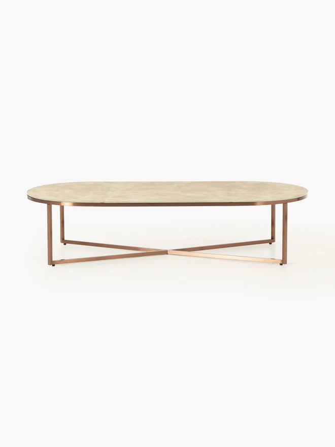 Struktur Firea Coffee Table terbuat dari rangka besi kuat dengan lapisan akhir berkilau yang menambah daya tarik visual. Kaki berbentuk silang memberikan stabilitas optimal sekaligus sentuhan geometris yang modern. Selain itu, permukaan marmer yang halus dan mudah dibersihkan menjadikannya praktis untuk penggunaan harian tanpa mengorbankan estetika. Meja ini mencerminkan keseimbangan ideal antara fungsionalitas dan keindahan.