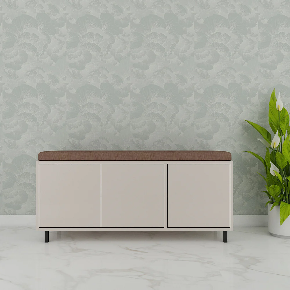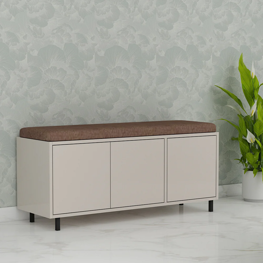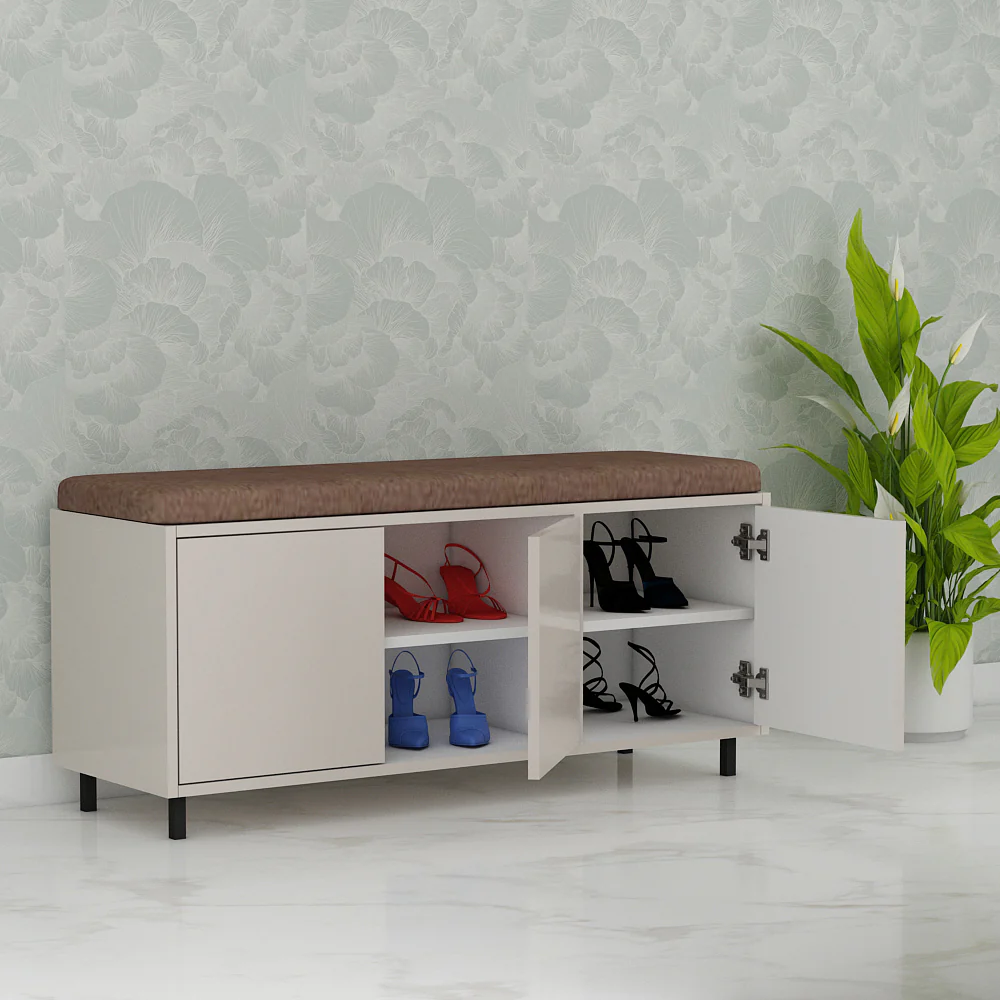 Ines Rack Shoe menghadirkan bangku rak sepatu putih dengan dudukan empuk cokelat. Produk ini punya tiga pintu lipat dan tiga kompartemen luas. Kaki besi hitam menjaga stabilitas sekaligus memberi kesan ringan. Finishing halus membuatnya mudah dibersihkan setiap hari.