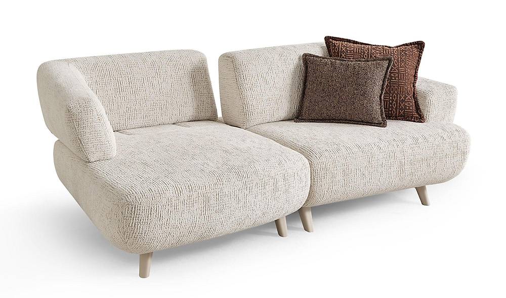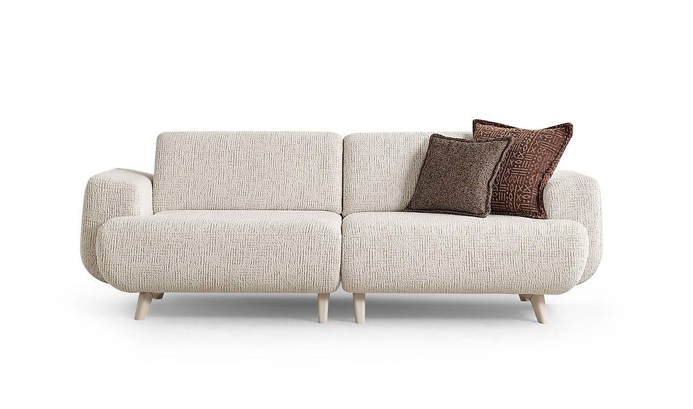 Daya tarik utama sofa ini terletak pada cara ia menghindari sudut tajam, berfokus pada bentuk yang lembut dan bersahaja.