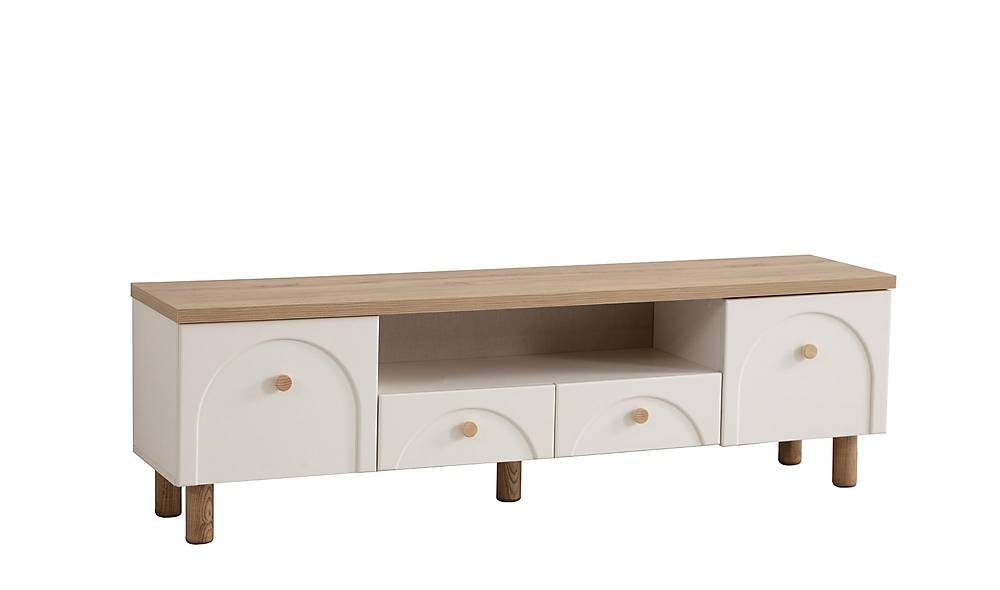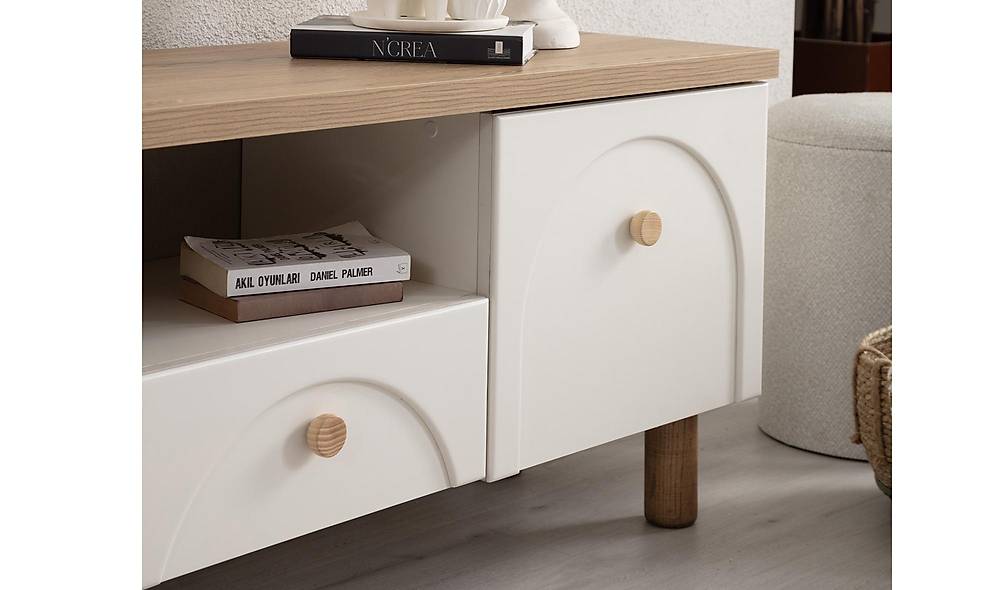 - Kombinasi Penyimpanan Terbuka & Tertutup: Kabinet ini memiliki dua laci tarik di tengah dan dua kompartemen tertutup di samping. Oleh karena itu, Anda dapat menyimpan remote, DVD, dan kabel di laci, sekaligus menyembunyikan set-top box di belakang pintu melengkung.