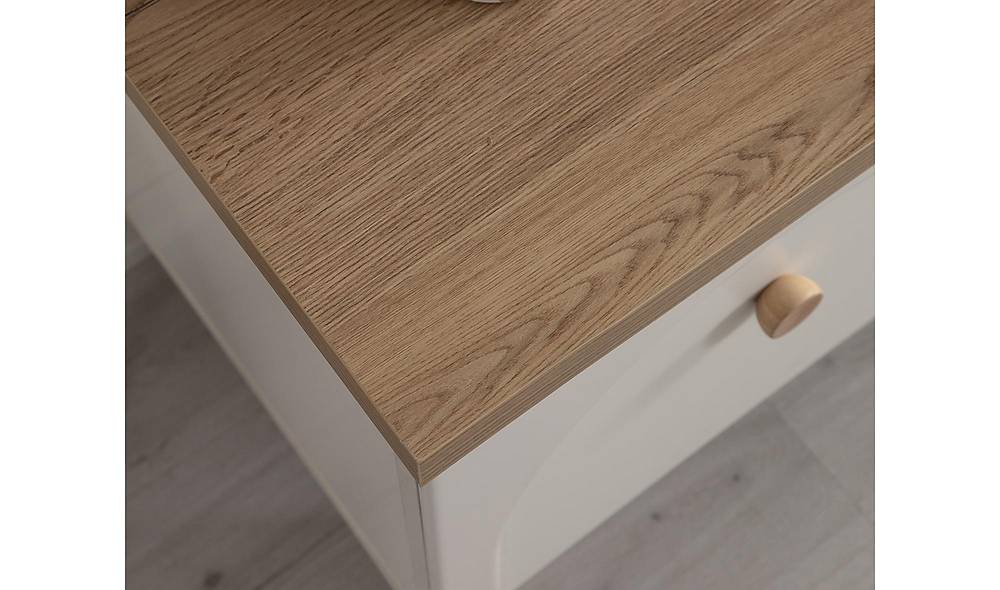 - Laci dan Handle Kayu: Selain itu, laci tengah dilengkapi dengan handle bundar kayu kecil. Detail ini menghubungkan semua elemen kayu dan memperkuat tema alami secara keseluruhan.