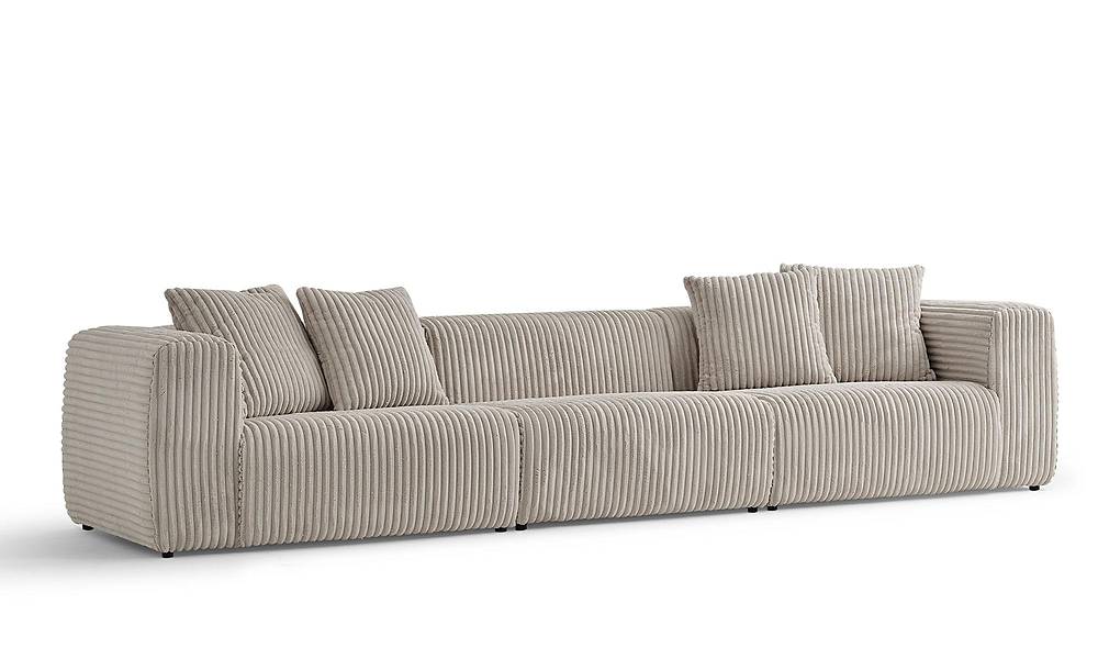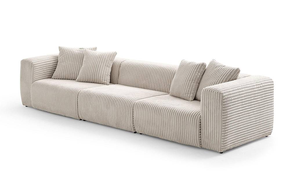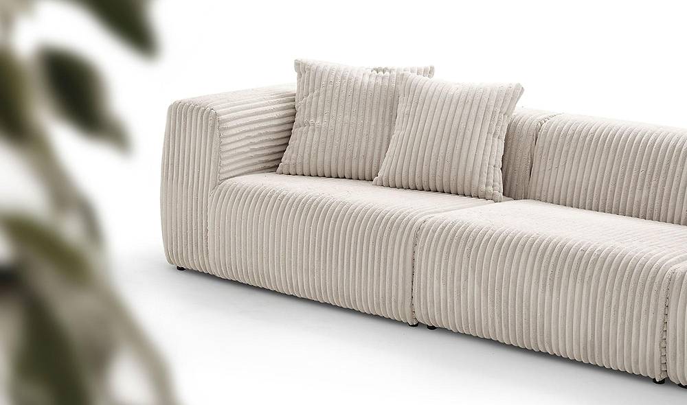 - Material Bertekstur: Seluruh permukaan sofa menggunakan kain bertekstur, kemungkinan jenis korduroi atau kain bergaris vertikal tipis. Tekstur ini menghadirkan dimensi visual yang menarik dan menambah kesan nyaman pada sofa.