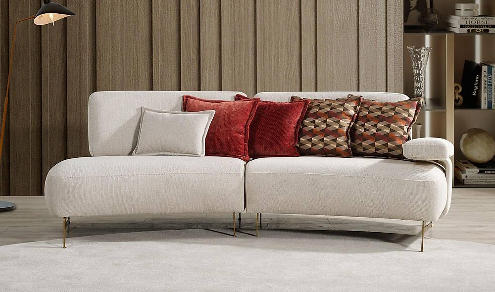 • Kaki Ramping Emas: Kaki logam yang sangat ramping dan meruncing dengan finishing warna emas atau champagne menciptakan kontras yang menawan. Kaki yang minimalis ini memberikan kesan sofa yang sedikit melayang, menambahkan sentuhan kemewahan modern (glam modern) pada desain yang lembut.