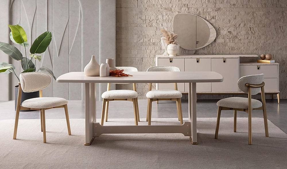 Set Meja Makan Kramat Jati adalah perwujudan sempurna dari desain ruang makan high-end yang fokus pada garis bersih, bentuk geometris, dan palet monokrom yang canggih. Set ini menciptakan suasana makan yang formal namun modern, menjadikannya pilihan ideal untuk interior urban kontemporer yang mengutamakan ketenangan visual dan tampilan yang polished.