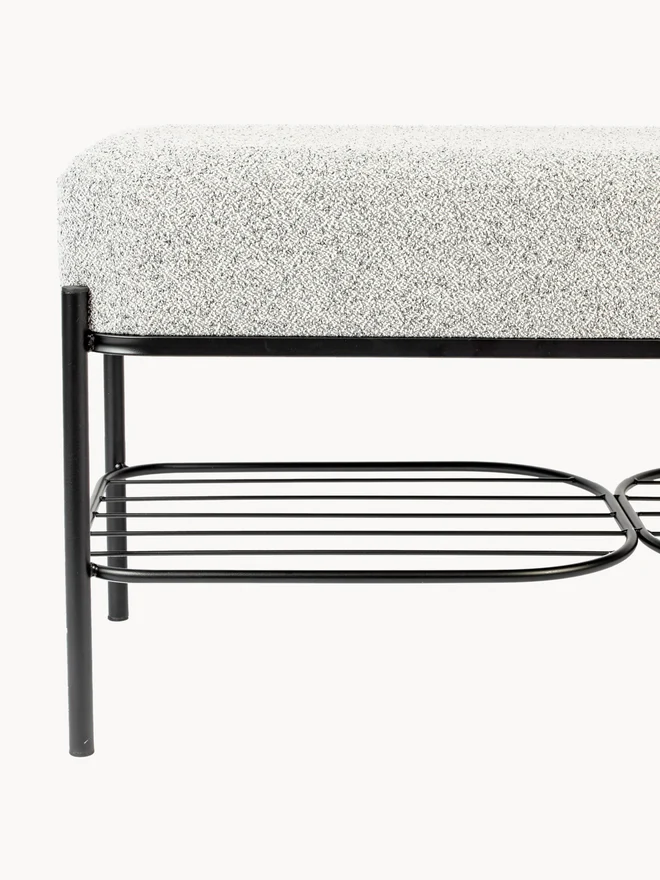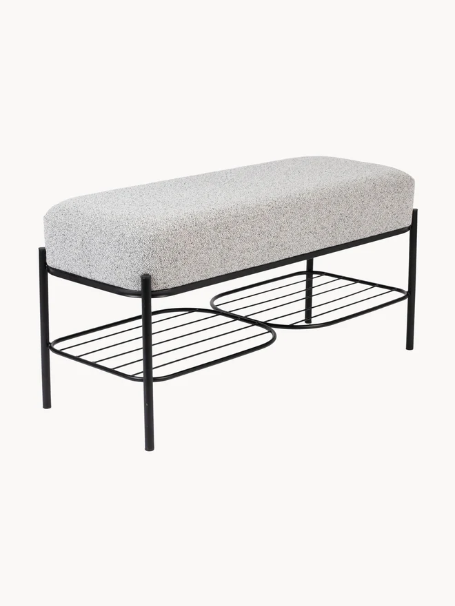 Linea Bench memadukan dudukan kain bouclé abu terang dengan rangka besi hitam yang ramping. Selain itu, bantalan tebalnya empuk, lalu ujung membulat membuat tampilan lembut dan modern. Di sisi bawah, dua rak kawat menyatu, sehingga kamu punya ruang simpan praktis.