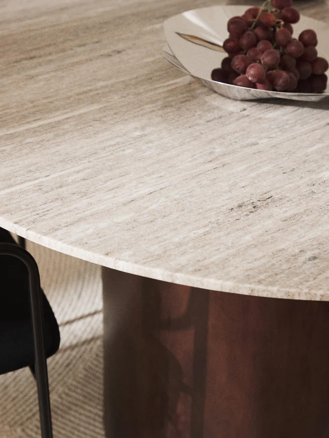 Perpaduan dua material ini menciptakan harmoni visual yang indah. Permukaan marmer menampilkan pola alami yang halus, memberikan sentuhan eksklusif pada ruang makan Anda. Sementara itu, kaki silindris dari kayu jati memberikan stabilitas dan menghadirkan kehangatan alami yang menyeimbangkan tampilan modern marmer.