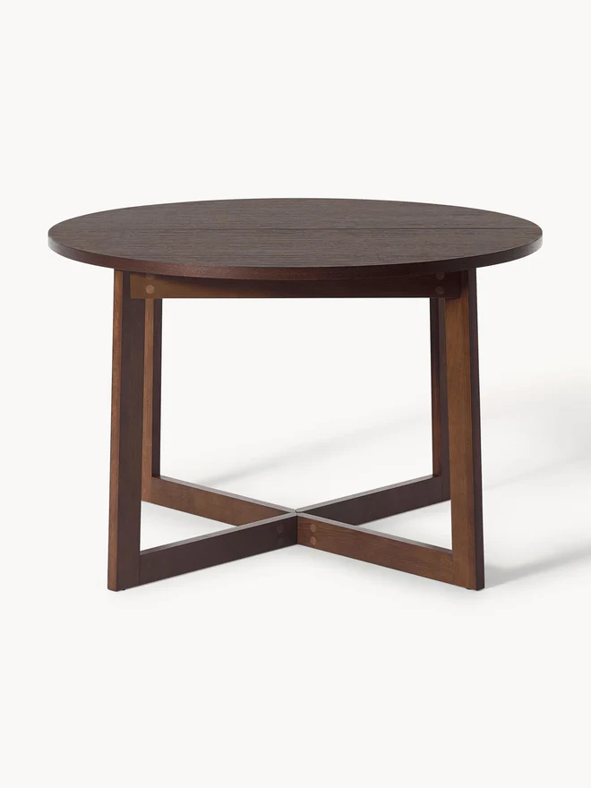 Rangkanya berbentuk silang geometris, memberikan kestabilan maksimal sekaligus memperkaya tampilan visualnya. Transisi antara kaki yang tegas dan permukaan meja yang halus menciptakan harmoni antara fungsi dan keindahan. Selain itu, warna cokelat tua pada kayu menambah kesan elegan dan mudah berpadu dengan berbagai gaya interior.