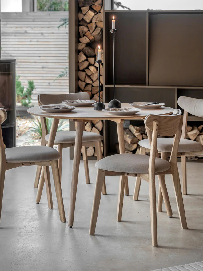 Dengan empat kaki ramping yang sedikit menjorok keluar, Luno menunjukkan keseimbangan antara stabilitas dan tampilan ringan. Permukaan bundarnya menciptakan suasana intim, sehingga setiap makan bersama terasa lebih hangat dan akrab. Selain itu, desainnya yang sederhana memudahkan meja ini berpadu dengan berbagai gaya interior, baik modern, skandinavia, maupun tropis alami.