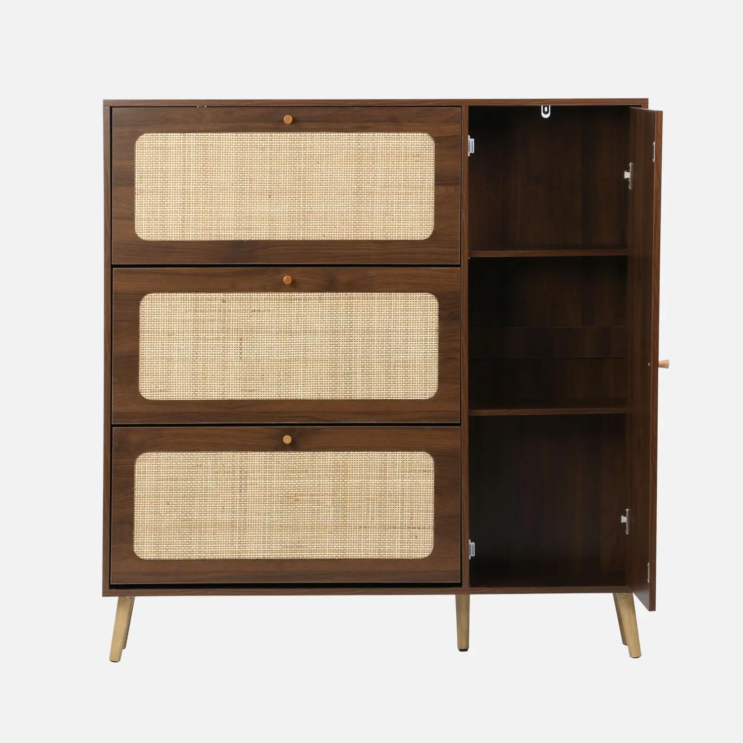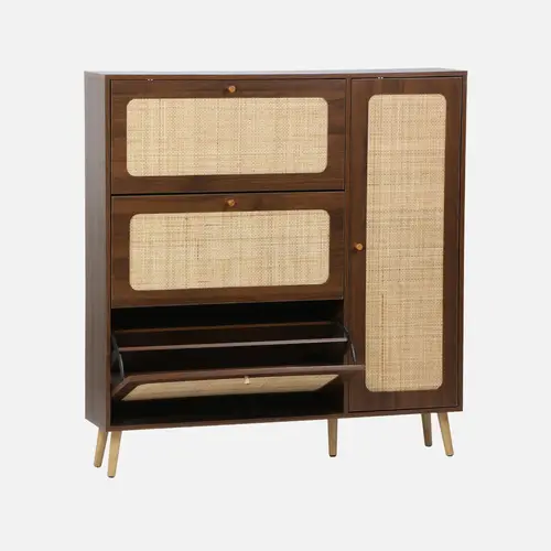Nirva Rack Shoe menghadirkan kabinet sepatu kayu walnut dengan panel anyaman rotan yang klasik. Anda mendapat tiga laci flip besar di kiri dan satu lemari tinggi di kanan. Selain itu, kaki kayu ramping memberi kesan ringan namun tetap kokoh. Detail knop bulat, garis bingkai rapi, dan rak dalam luas membuat tampilannya premium.