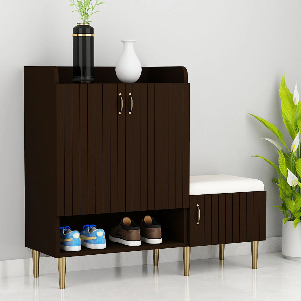 Nolan Rack Shoe menghadirkan kabinet sepatu cokelat gelap dengan panel slat vertikal yang elegan. Kabinet ini memiliki dua pintu utama, rak dalam bertingkat, dan kompartemen samping dengan cushion duduk. Selain itu, handle emas dan kaki tapered memberi aksen mewah sekaligus stabil.