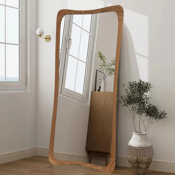 Oria Mirror menampilkan bingkai kayu solid warna natural yang hangat. Selain itu, bentuk persegi panjang bergelombang memberi kesan organik modern. Kemudian, kaca jernih memantulkan cahaya dengan tajam dan merata. Lebih lanjut, sudut membulat membuat tampilan lembut dan aman. Akhirnya, frame tipis menjaga cermin terlihat ringan di dinding.