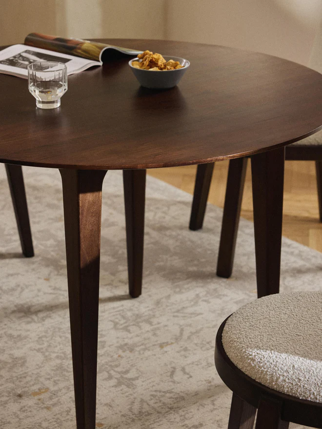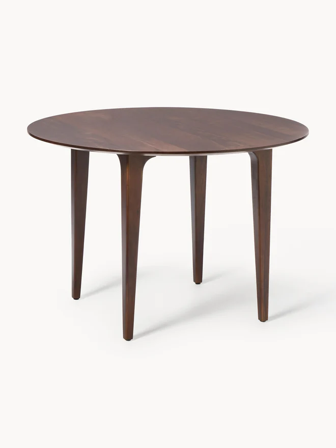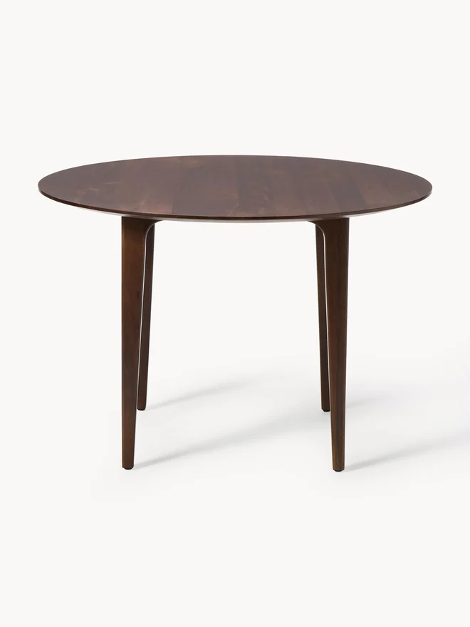 Padmaru Dining Table menawarkan desain elegan dengan sentuhan modern melalui bentuk bundar klasik dan kaki ramping yang meruncing. Terbuat dari kayu solid berkualitas dengan finishing cokelat gelap yang menawan, meja ini memberikan kesan hangat sekaligus premium. Detail lekukan pada kaki menambah karakter visual yang lembut, sementara permukaannya yang halus memberikan estetika natural yang sangat memanjakan mata.