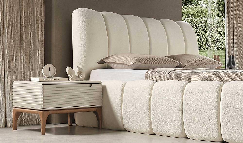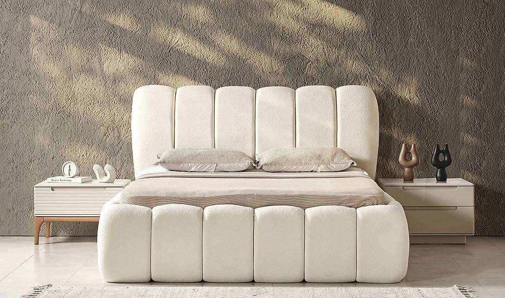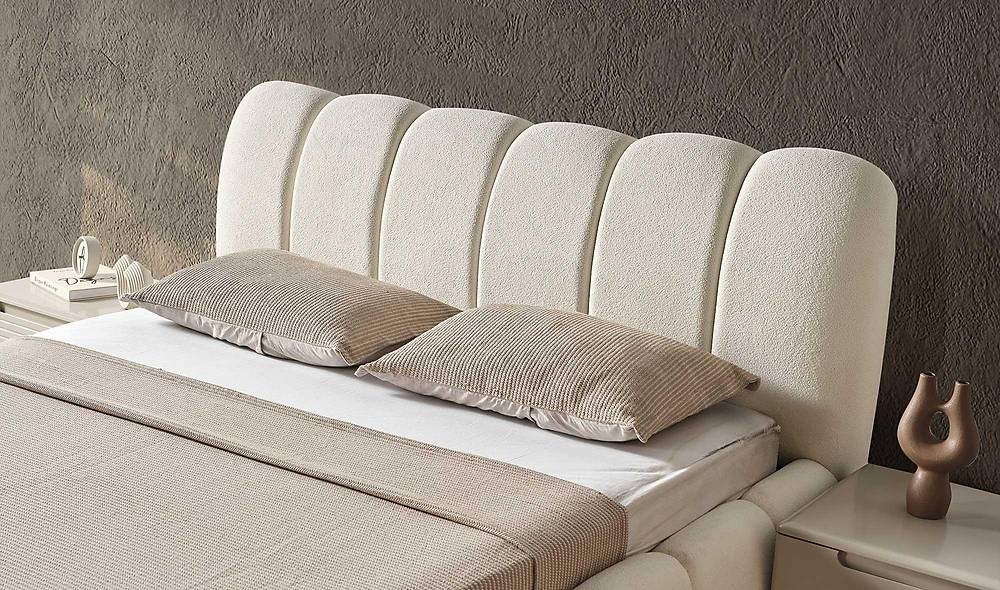 Kain berwarna putih tulang dengan tekstur bouclé yang lembut dan berbulu melapisi seluruh permukaan tempat tidur. Tekstur ini tidak hanya menambah kenyamanan, tetapi juga memberikan sentuhan mewah dan hangat. Bentuk headboard yang melengkung di bagian atas juga menambah kesan lembut dan organik pada desainnya.