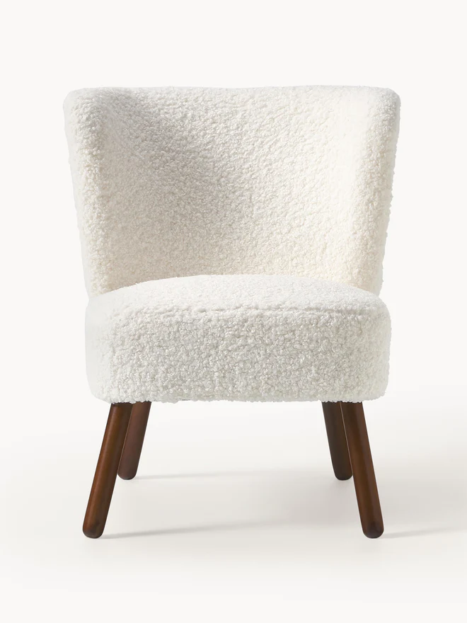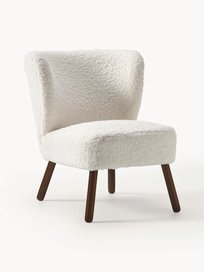 Pranava Lounge Chair menonjolkan balutan bouclé putih yang tebal dan lembut. Selain itu, dudukan busa padat terasa empuk, lalu sandaran lebar memeluk punggung. Di sisi lain, kaki kayu walnut miring memberi kontras hangat serta menjaga stabilitas.