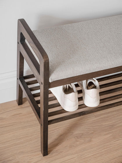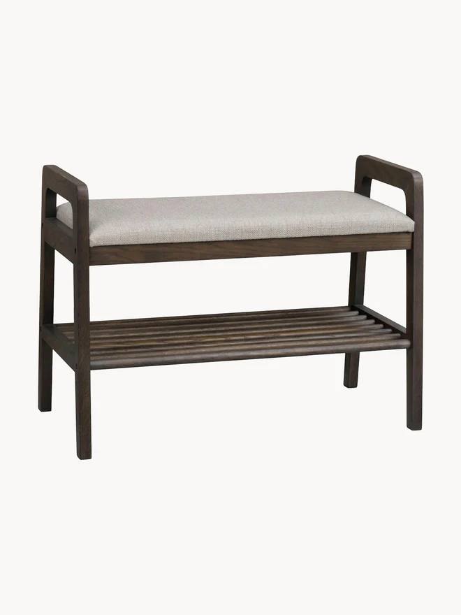 Raku Bench adalah bangku kayu bergaya minimalis dengan rangka warna walnut gelap dan dudukan cushion kain abu terang. Pertama, struktur kayunya kokoh, lalu sandaran samping berbentuk bingkai memberi pegangan yang nyaman. Selain itu, bantalan busa empuk membuat permukaan duduk lebih hangat, sementara rak bawah model bilah menyediakan ruang ekstra tanpa mengganggu tampilan rapi. Jadi, kamu mendapatkan bench yang estetis sekaligus kuat untuk pemakaian harian.