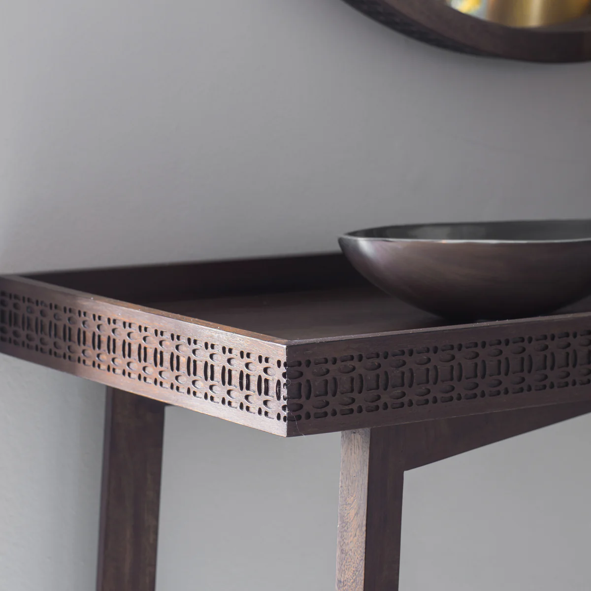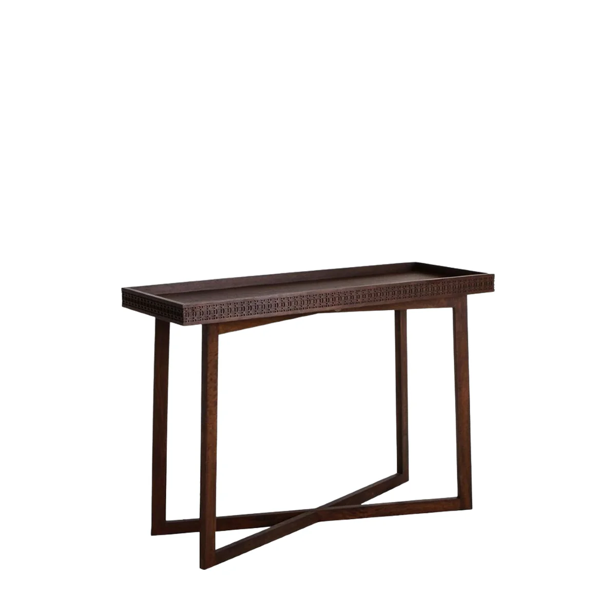 Rona Side Table dibuat dari kayu gelap solid, dengan top datar berbingkai, serta ukiran detail pada sisi atas. Selain itu, kaki rangka geometris menyilang memberi karakter etnik modern, sementara finishingnya terlihat hangat dan elegan. Dengan demikian, bentuk konsol yang ramping tetap terasa kokoh dan stabil untuk pemakaian harian.