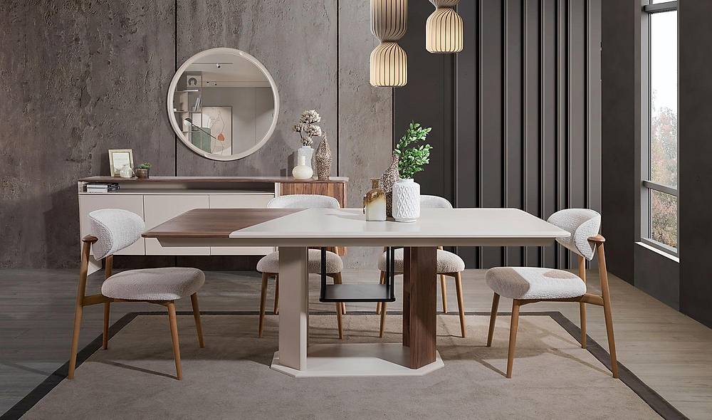 Pertama-tama, Set Makan Semarang segera menarik perhatian melalui penggunaan material kayu dengan finishing natural. Elemen kayu pada kaki meja yang kokoh dan kerangka kursi memancarkan aura hangat, yang sangat khas dari gaya Scandinavian. Kemudian, meja makan menggunakan permukaan warna krem/putih lembut yang kontras dengan aksen kayu tersebut, sehingga menghasilkan tampilan yang cerah dan lapang.