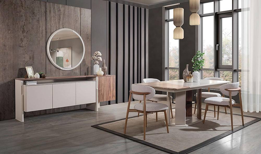 Di samping itu, karpet berwarna netral seperti abu-abu muda atau beige akan membingkai area Semarang Dining Set dengan sempurna, sekaligus menambah tekstur lembut di lantai. Terakhir, tambahkan sentuhan vas keramik putih dan tanaman hijau minimalis di atas sideboard atau meja. Dengan demikian, Anda berhasil menciptakan ruang makan dengan nuansa Japandi yang menenangkan dan instagrammable.