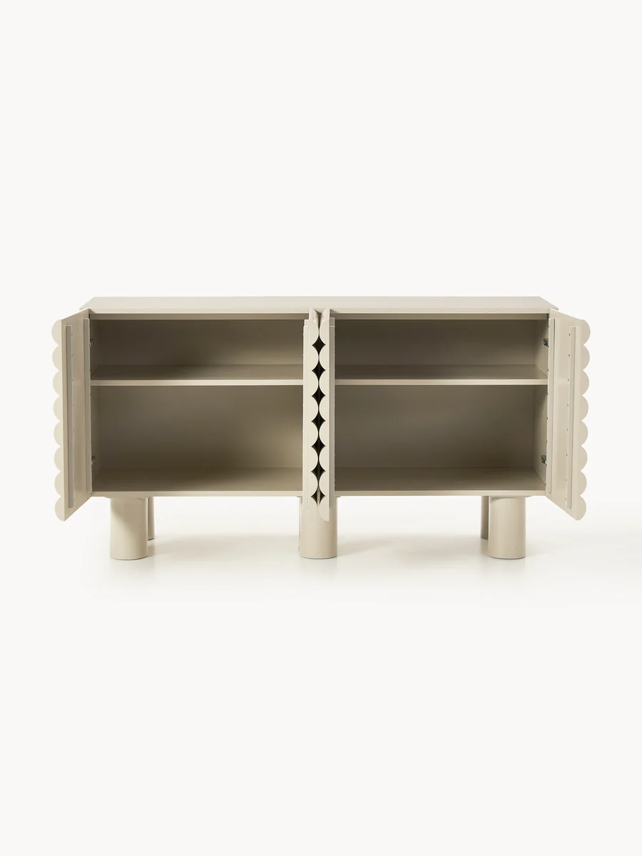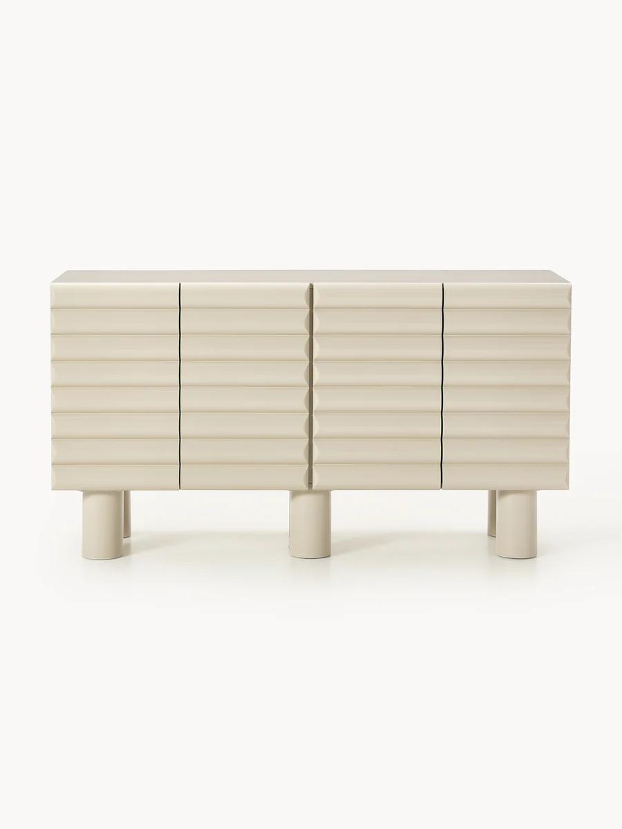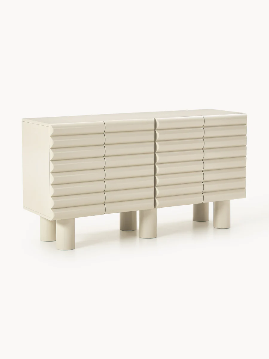 Sideboard Srekran hadir sebagai perpaduan sempurna antara kekuatan material alami dan desain kontemporer yang mencolok. Kami buat seluruhnya dari kayu jati solid Grade A, sideboard ini menawarkan daya tahan jangka panjang serta keindahan serat kayu alami yang tak tertandingi. Setiap detail konstruksi kami rancang untuk memastikan kestabilan dan keawetan, menjadikannya investasi furnitur yang berharga. Desainnya menampilkan fasad pintu bertekstur unik dengan alur horizontal yang tegas, menciptakan dimensi visual yang kaya. Dengan kaki-kaki berbentuk silinder yang kokoh, lemari pajangan ini memancarkan aura chic sekaligus playful, cocok menjadi focal point di ruang tamu, ruang makan, atau bahkan koridor Anda.