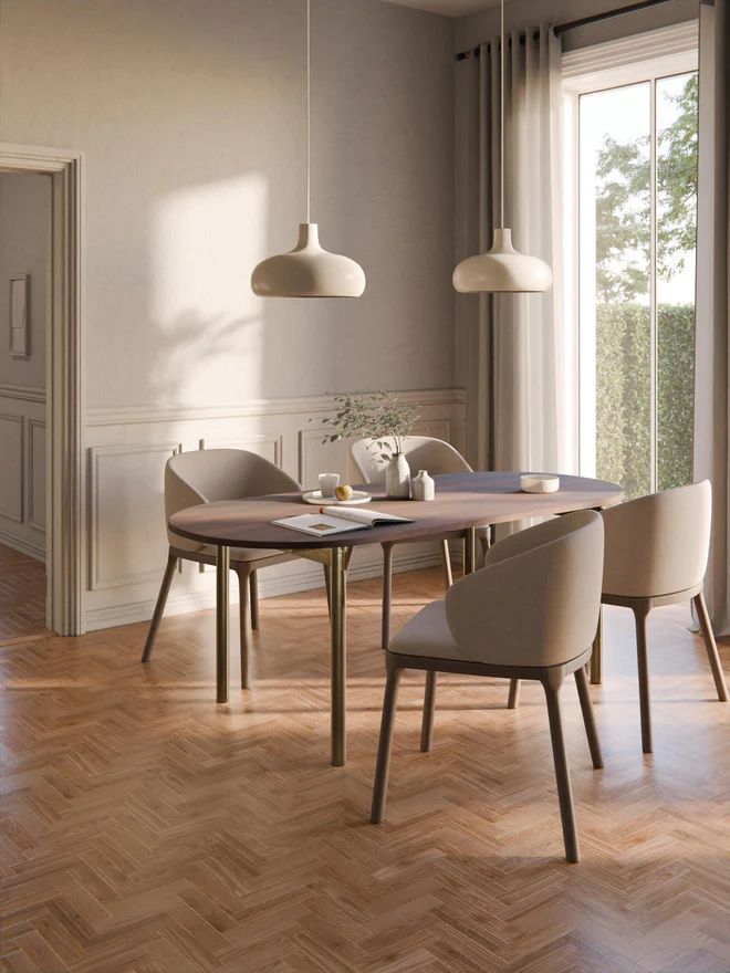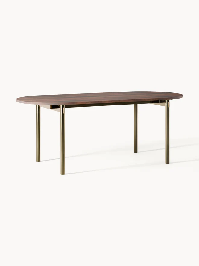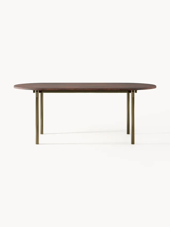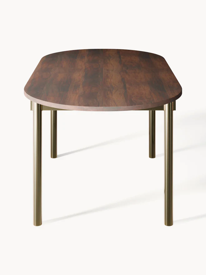 Sivo Dining Table menghadirkan kombinasi elegan antara kayu solid bernuansa gelap dan kaki metal berlapis warna emas yang memberi kesan mewah serta modern. Dengan bentuk oval yang lembut, meja ini menawarkan tampilan kontemporer yang tetap hangat berkat tekstur kayu yang kaya. Setiap detailnya kami rancang untuk menciptakan pusat perhatian di ruang makan tanpa mengorbankan fungsi dan kenyamanan.