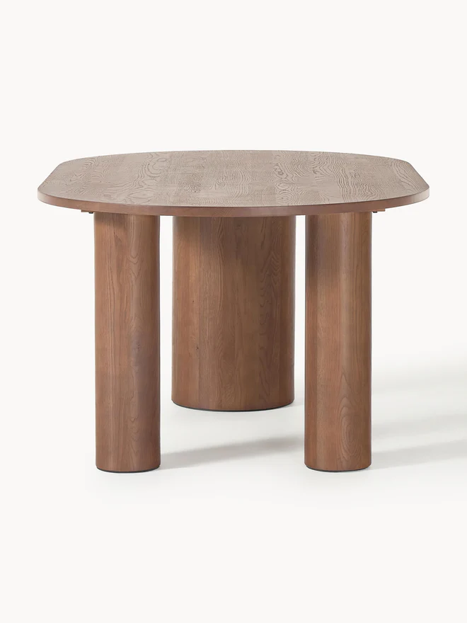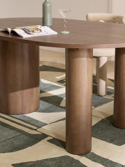 Suma Dining Table menampilkan desain elegan dengan sentuhan modern melalui penggunaan kaki berbentuk silinder besar yang memberikan karakter kuat pada ruang makan. Meja ini berbahan dari material kayu berkualitas dengan finishing hangat yang menonjolkan tekstur alami. Bentuk permukaan yang membulat lembut memberi kesan lembut sekaligus tetap mewah.