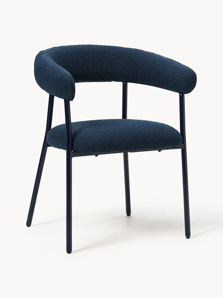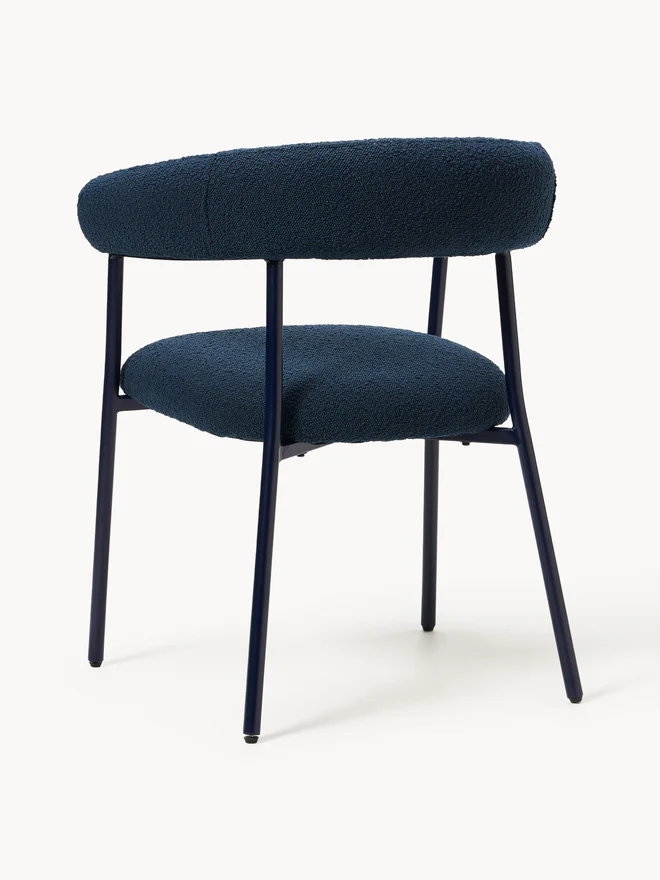 Sumira Dining Chair menghadirkan tampilan kontemporer dengan sentuhan elegan yang tak lekang oleh waktu. Desainnya yang minimalis menonjolkan keseimbangan sempurna antara bentuk dan fungsi. Rangka logam berlapis warna biru tua berpadu harmonis dengan bantalan empuk berlapis kain bouclé lembut, menciptakan tampilan modern yang tetap terasa hangat dan mengundang.