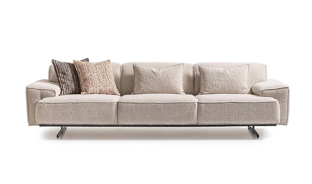 - Siluet Modern dan Terstruktur: Sofa ini memiliki bentuk yang terstruktur dan bersudut tegas, namun tetap terlihat lembut karena material dan bantalannya. Desainnya yang kotak dan bersih memberikan kesan modern dan rapi.