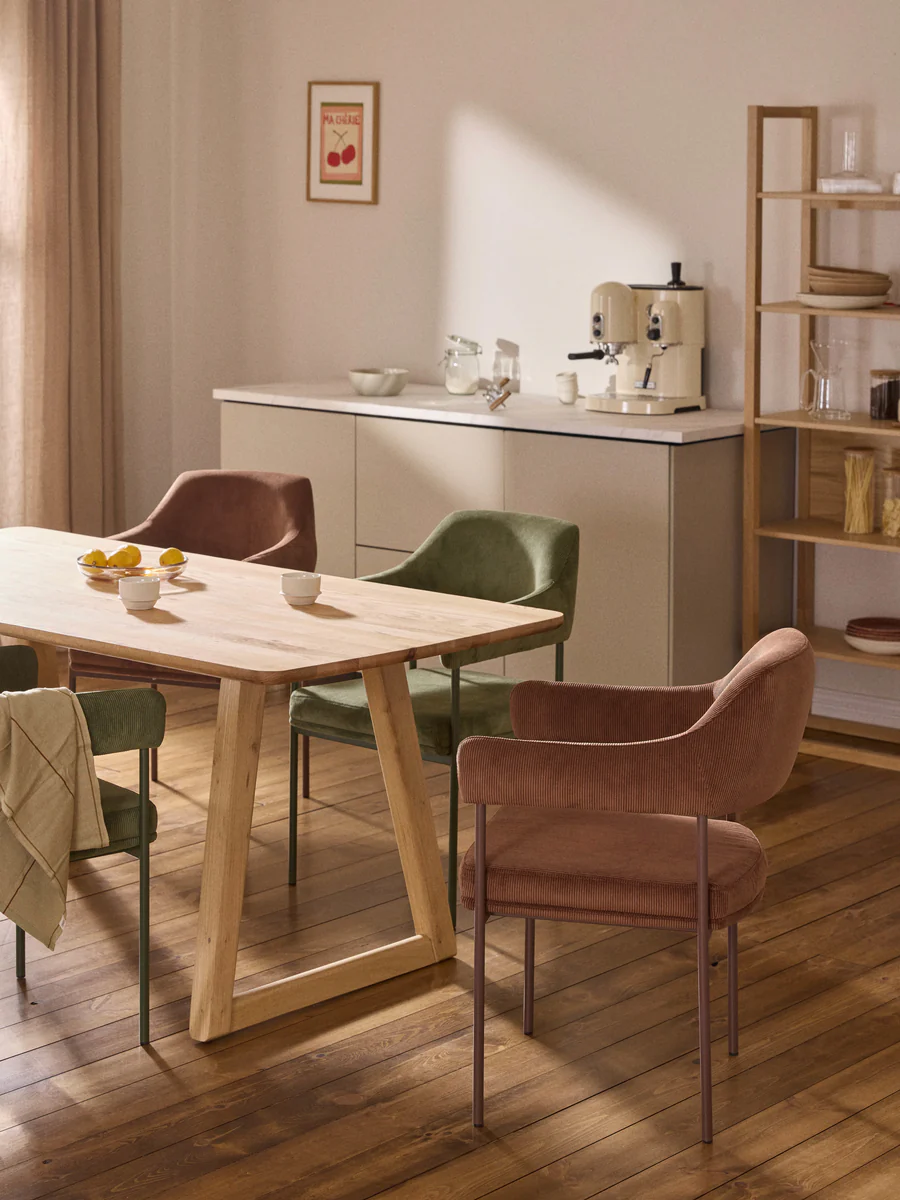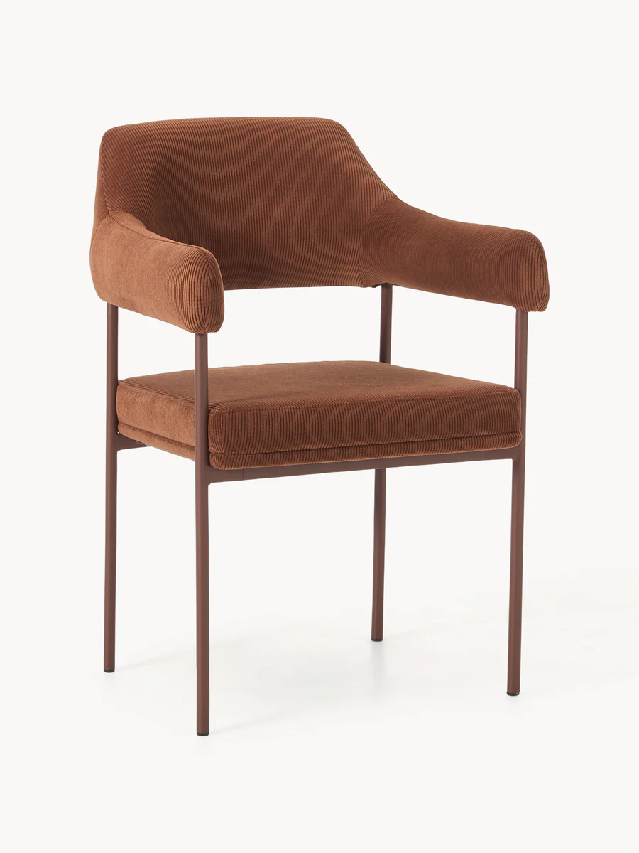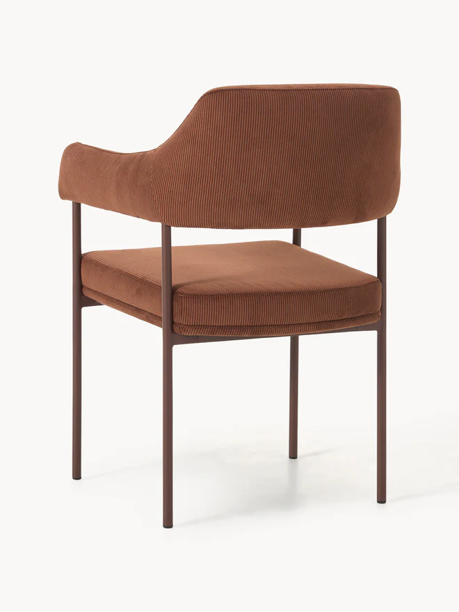 Vanita Dining Chair menghadirkan perpaduan sempurna antara gaya kontemporer dan kenyamanan premium. Dengan rangka logam ramping berwarna cokelat matte dan bantalan berlapis kain korduroi halus, kursi ini memancarkan kesan hangat sekaligus modern. Desainnya yang berani namun tetap lembut menjadikannya pusat perhatian di ruang makan, cocok untuk interior bergaya industrial, modern, maupun eklektik.