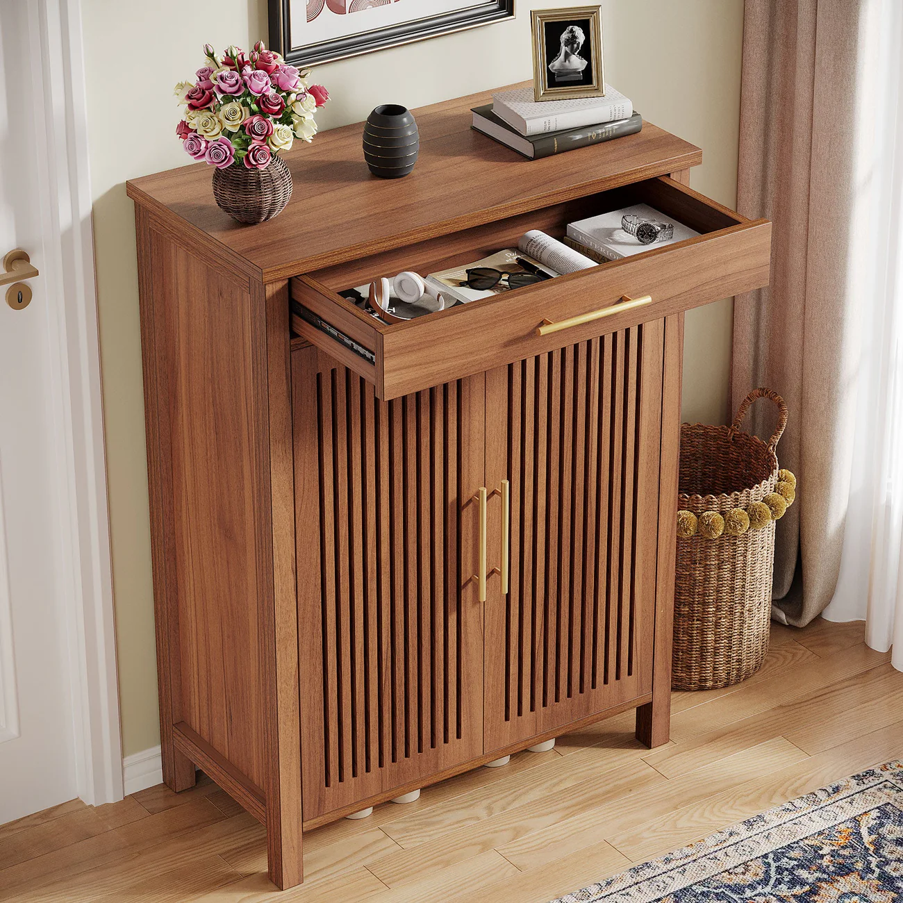 Produk ini menyimpan sepatu dengan lebih teratur dan mudah dijangkau. Desainnya menyesuaikan berbagai gaya interior seperti minimalis, modern, dan Scandinavian. Selain itu, kabinet ini cocok untuk area foyer, kamar tidur, dan ruang keluarga. Anda bisa menempatkannya sebagai elemen dekoratif sekaligus penyimpanan fungsional.
