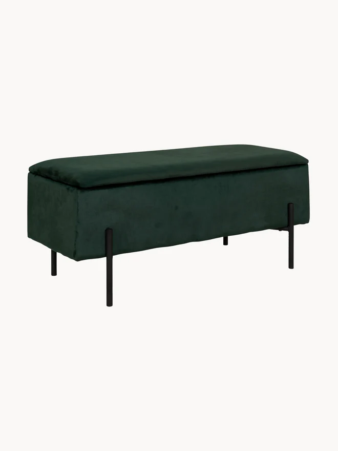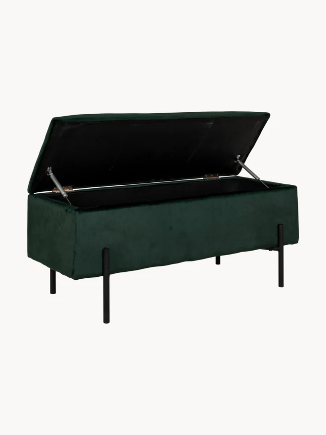 Verta Bench adalah storage bench bergaya modern dengan balutan kain hijau tua yang elegan dan dudukan tebal empuk. Pertama, bentuknya memanjang dengan sudut membulat sehingga terlihat lembut di ruangan, lalu kaki besi ramping warna hitam memberi kontras minimalis yang kokoh. Selain itu, tutup dudukan memakai engsel hidrolik yang mudah kamu buka-tutup, sehingga bagian dalamnya menjadi ruang simpan tersembunyi yang rapi. Jadi, Verta Bench tidak hanya nyaman, tetapi juga cerdas untuk rumah modern.