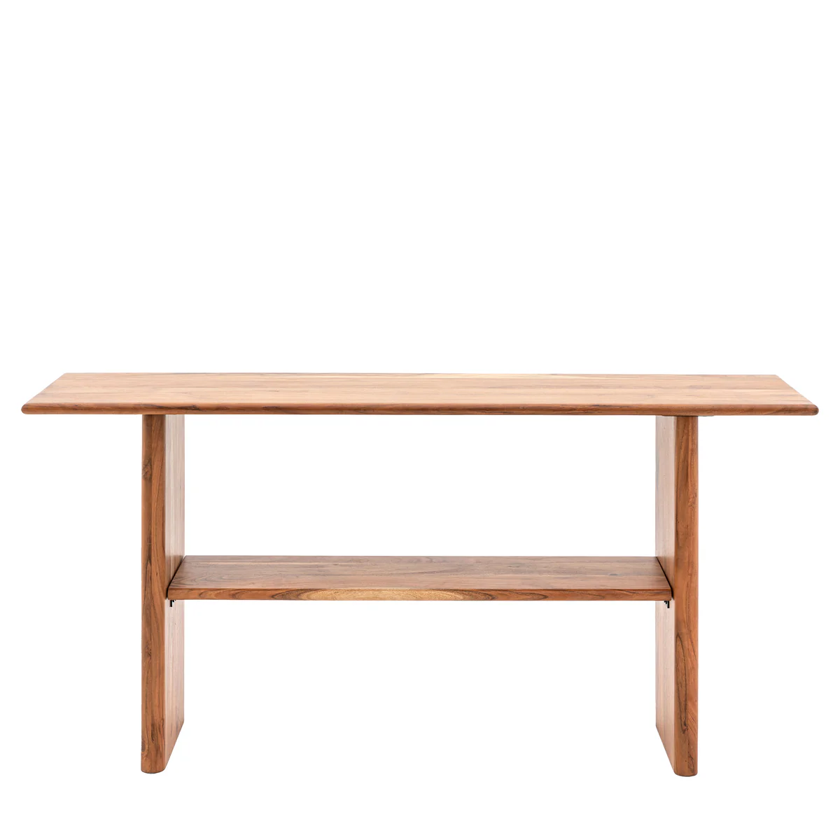 Wana Side Table hadir sebagai meja konsol kayu natural dengan desain ramping dan sudut membulat. Top meja memanjang memberi area luas untuk dekorasi tanpa terlihat penuh. Rak terbuka di bawahnya menyimpan buku, vas, atau keranjang dengan mudah. Konstruksi kayu tebal menjaga meja tetap kuat dan stabil untuk pemakaian harian.