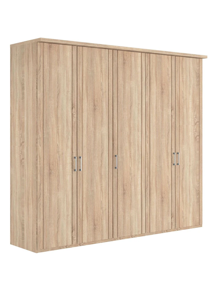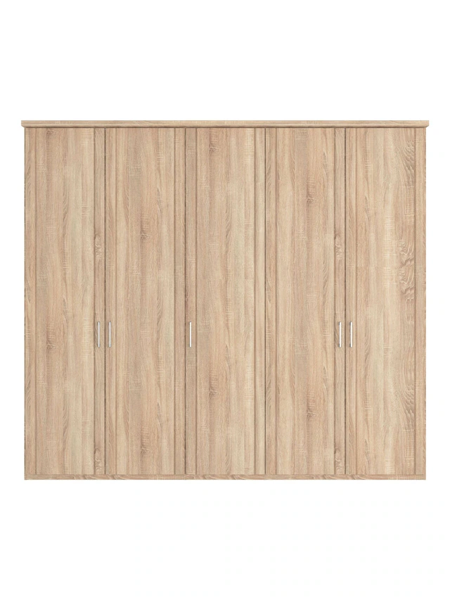 Wardrobe 5 pintu dengan desain modern dan fungsional, menawarkan kapasitas penyimpanan yang luas berkat susunan kabinet berdiri vertikal, dilengkapi pintu dengan handle ergonomis untuk akses cepat serta menjaga tampilan rapi ruangan.