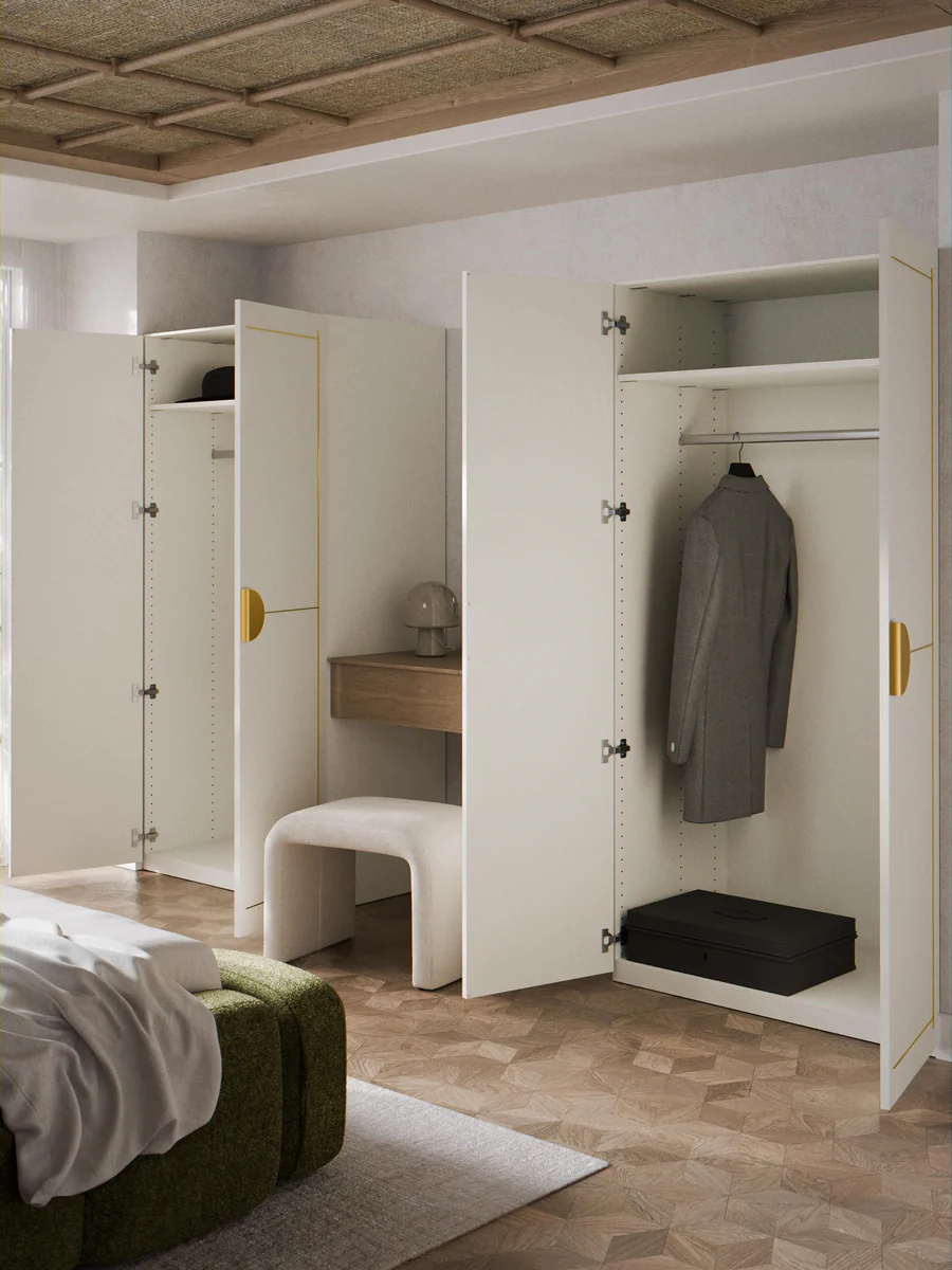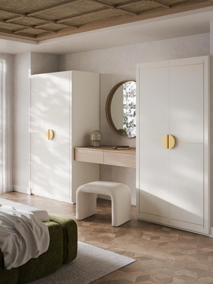 Selanjutnya, setiap pintu wardrobe dirancang dengan garis geometris halus untuk menonjolkan gaya bersih dan berimbang. Tak hanya itu, gagang bulat berwarna emas berfungsi sebagai aksen visual yang menambah karakter sekaligus memperkuat kesan minimalis. Lebih jauh, ruang penyimpanan yang luas membuat produk ini ideal untuk menjaga kerapian kamar tanpa mengorbankan estetika. Dengan demikian, wardrobe ini menjadi perpaduan sempurna antara keindahan dan kegunaan.