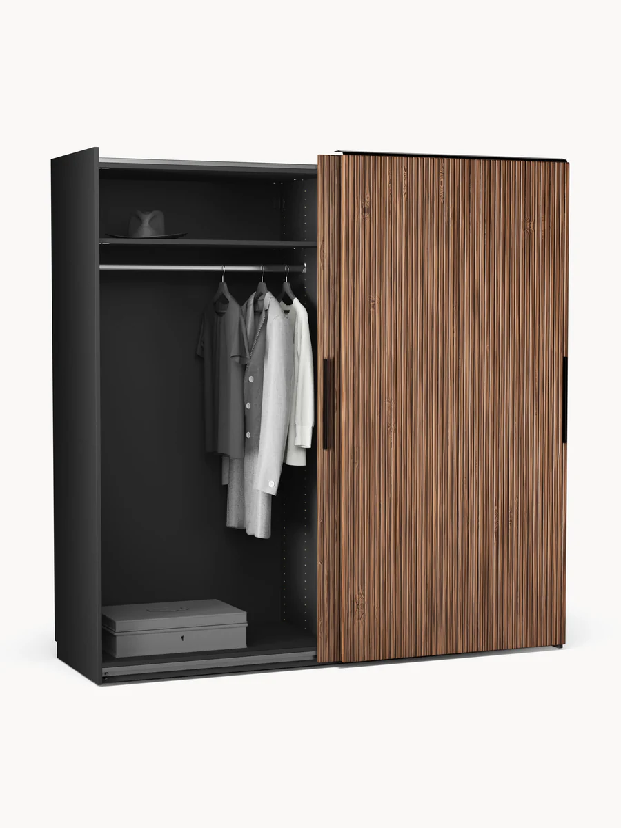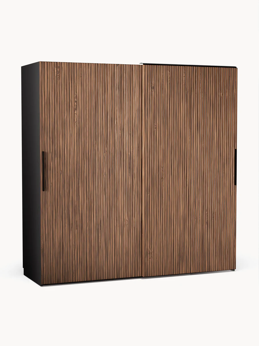 Wardrobe nek modern bergaya industrial ini menghadirkan perpaduan sempurna antara kekuatan dan keanggunan. Dengan rangka berwarna hitam matte yang kokoh serta pintu geser bermotif kayu alami, desainnya menonjolkan karakter maskulin namun tetap elegan. Selain itu, tekstur kayu vertikal pada pintu menciptakan kesan dinamis yang memperkaya tampilan interior ruangan Anda. Secara keseluruhan, lemari ini tidak hanya berfungsi sebagai penyimpanan, tetapi juga elemen dekoratif yang memperkuat gaya modern ruang tidur.